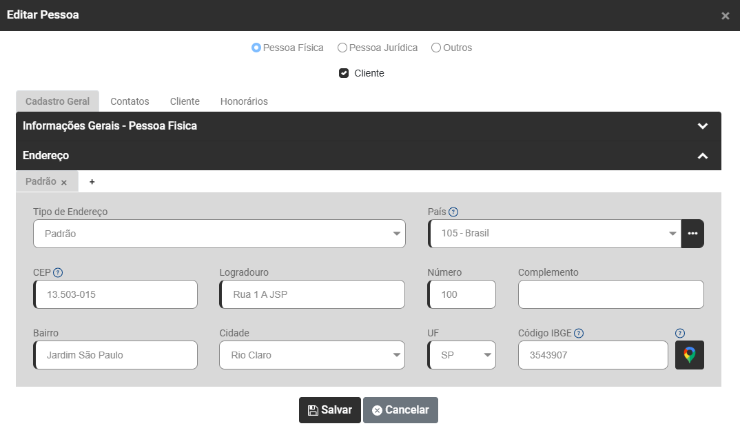 Ao clicar no botão Adicionar o Sistema apresentará a tela para Cadastrar Cliente, você deverá informar: