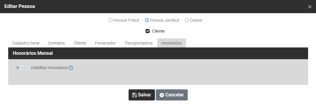 - Habilitar Honorários - Informações para o cadastro e configuração da cobrança dos honorários mensais. Esta funcionalidade está disponível apenas para o Sistema Adecon