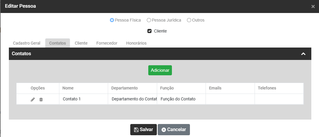 Clique no botão Adicionar para informar os Contatos