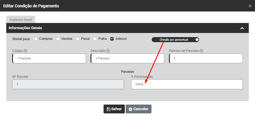 Ao acessar o botão Adicionar será apresentada a tela de Cadastro Geral da Condição de Pagamento