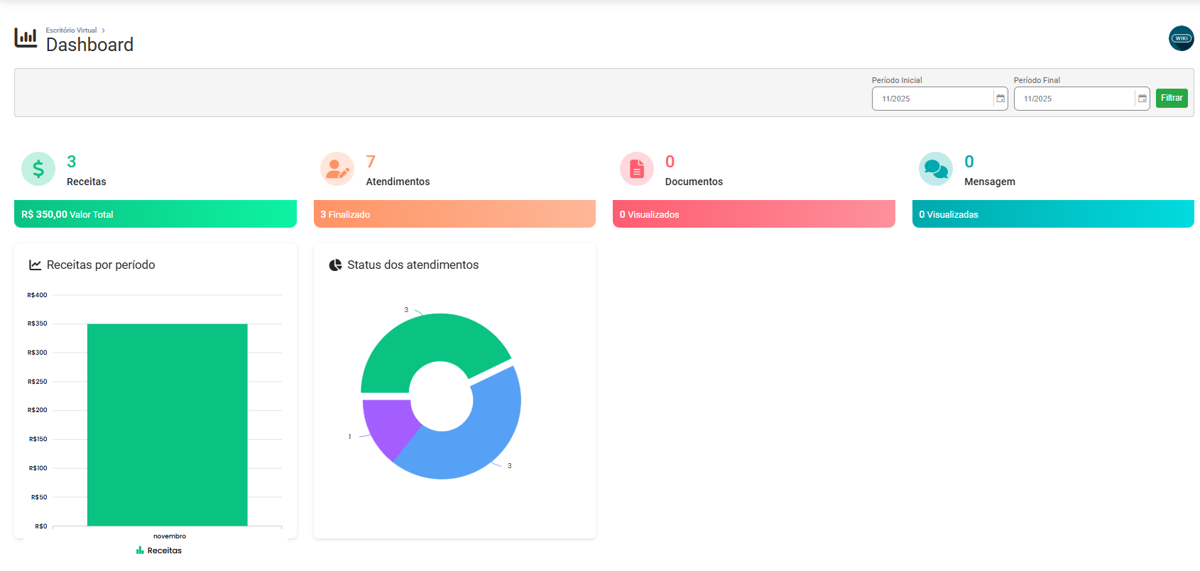 Dashboard (Receitas, Atendimentos, Documentos e Mensagens)