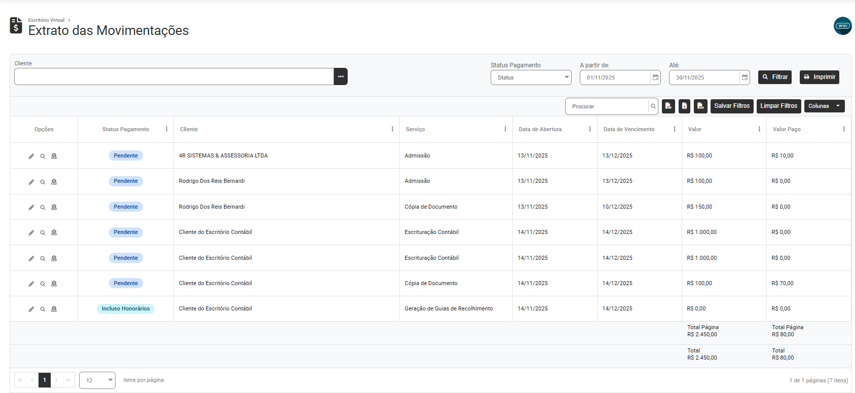 O Extrato das Movimentações trará uma visão Geral de Todas as Movimentações realizadas no Sistema Escritório Virtual