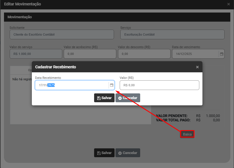 Ao clicar no botão Baixar, o Sistema apresentará a tela para que você realize baixas na Movimentação, defina: