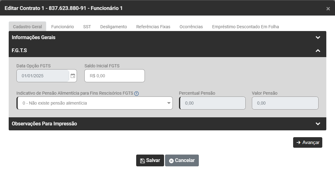 Edite os Dados Contratuais do Trabalhador que apresentou a inconsistência na aba Cadastro Geral>FGTS e confira as informações da Data de Opção FGTS