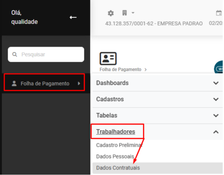 Como corrigir: Acesse o menu Folha de Pagamento>Trabalhadores>Dados Contratuais