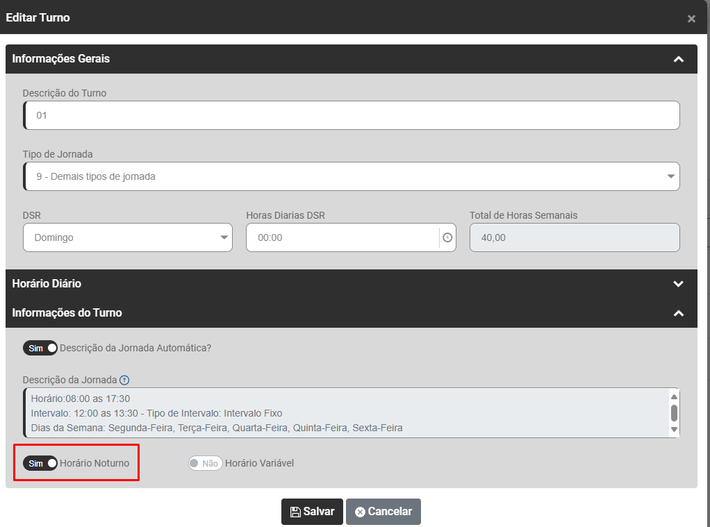 Descrição: Campo de preenchimento obrigatório: Horário Noturno.
