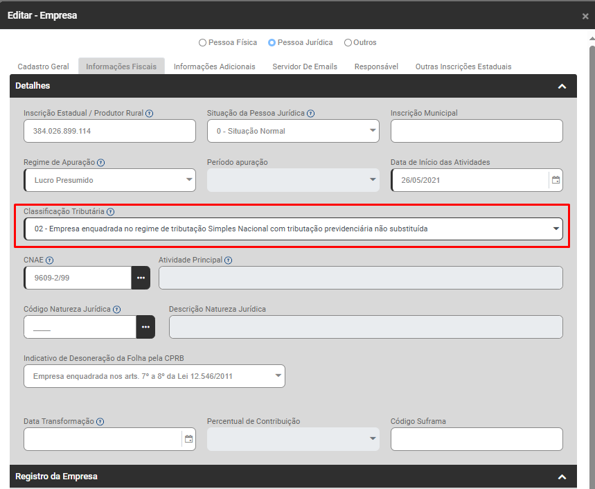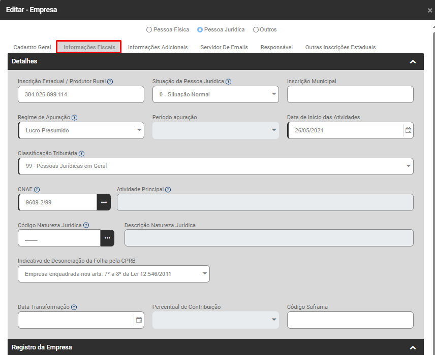 Edite a Empresa que apresentou a inconsistência e acesse a aba Informações Fiscais