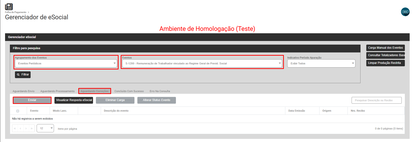 Filtre por Eventos Periódicos - S-1200, Aguardando Correção e faça o envio do evento