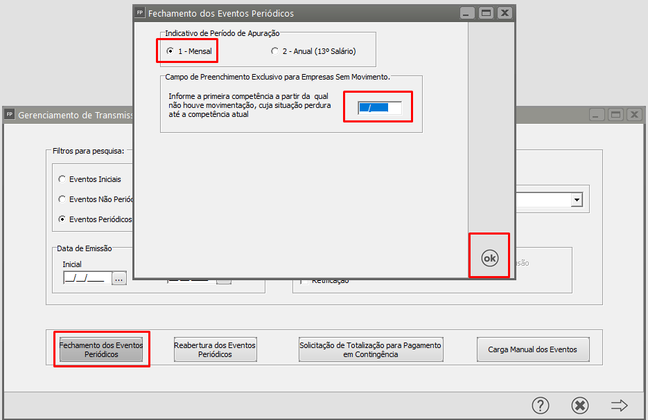 Crie uma nova carga de fechamento, preenchendo o "Campo de Preenchimento Exclusivo para Empresas Sem Movimento" > Clique em OK