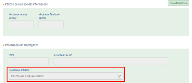 Ação Sugerida: Verifique se a classificação tributária indicada no portal do e-Social corresponde com a classificação tributária no sistema.