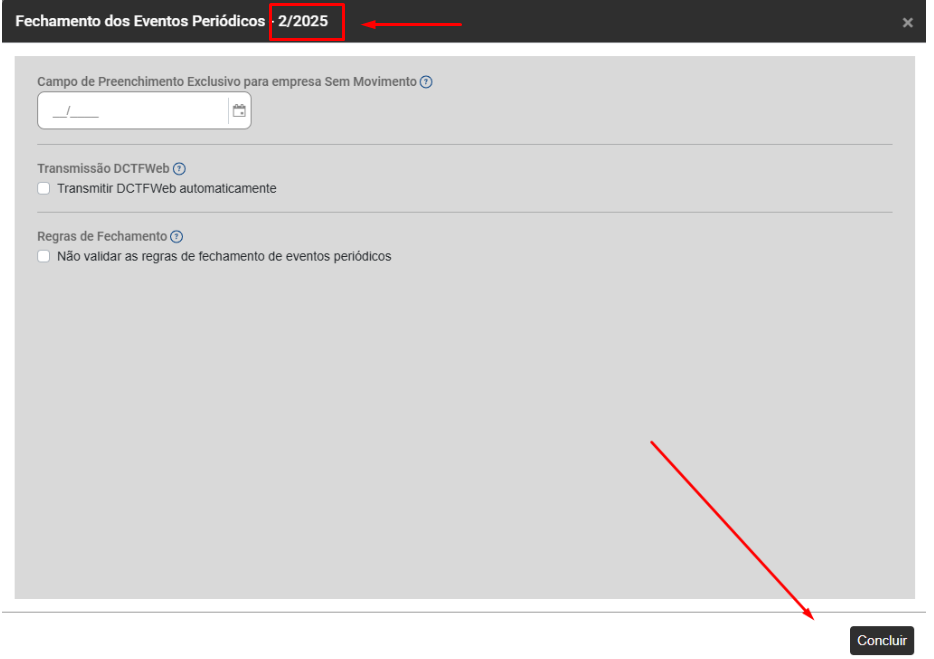 Confira a data informada na tela de geração do Evento e clique em Concluir