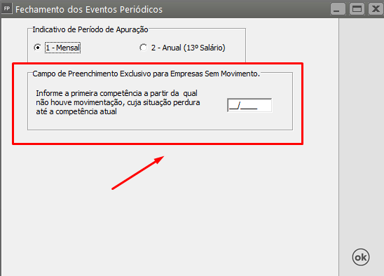 Descrição: Campo de preenchimento obrigatório: Primeira competência a partir da qual não houve movimento