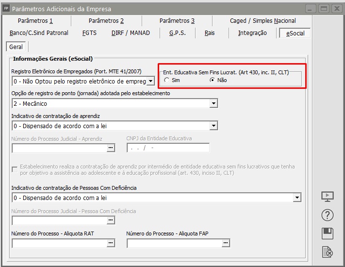 Evento S-1000 > O empregador/contribuinte deverá informar se é uma entidade educativa sem fins lucrativos que tenha por objetivo a assistência ao adolescente e à educação profissional (art. 430, inciso II, da CLT), bem como se é empresa de trabalho temporário (Lei n° 6.019/1974), com registro no Ministério do Trabalho, para isso acesse o menu Manutenção>Empresas>Parâmetros Adicionais da Empresa - aba eSocial e selecione a opção Entidade Educativa Sem Fins Lucrativos.