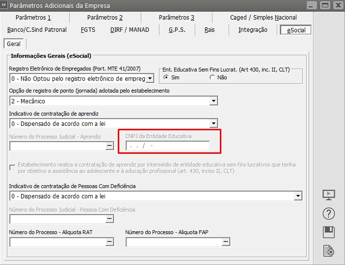 (art. 430, inciso II, da CLT), deverá informar o(s) número(s) de inscrição dessa(s) entidade(s) no menu Manutenção/Empresas/Parâmetros Adicionais da Empresa - aba eSocial, campo CNPJ da Entidade Educativa