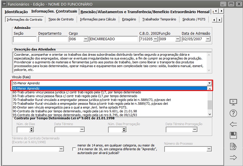Em seguida deverá ser acessado o cadastro do funcionário e informado que o mesmo é Aprendiz
