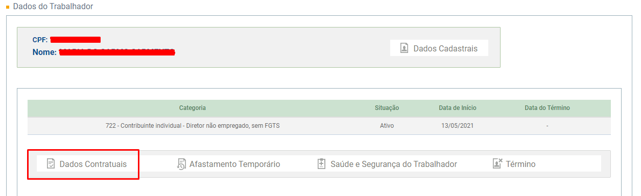 Agora, acesse o Site do portal do e-Social, entre no cadastro do sócio através do menu 'Trabalhador sem vínculo > Gestão de Trabalhadores', e acesse os 'Dados Contratuais'.