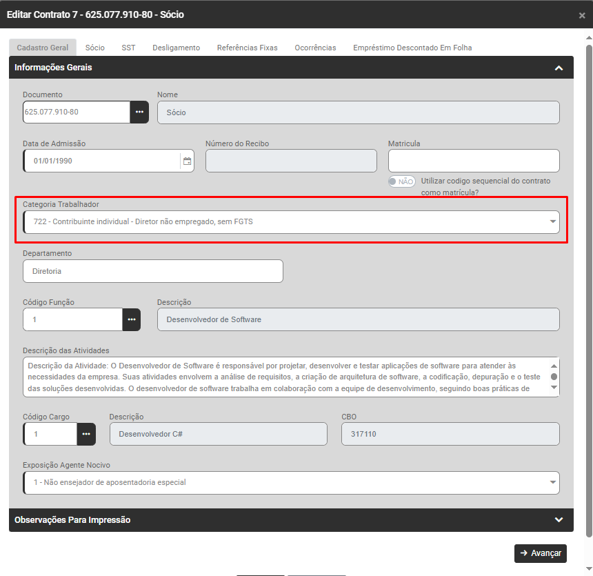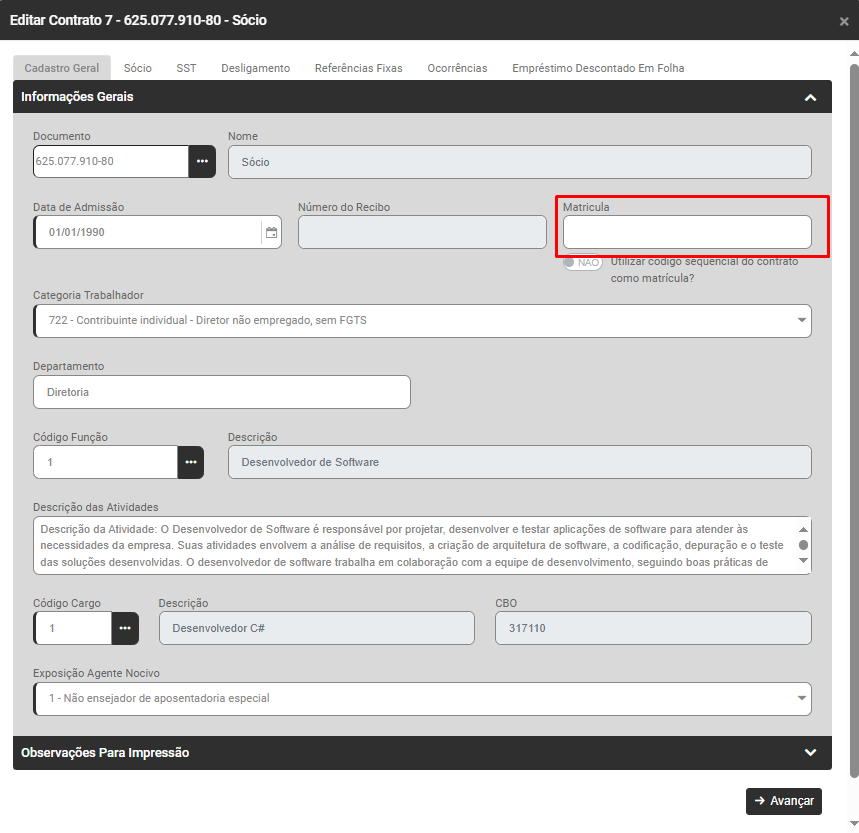 Ação Sugerida: Verificar se sócio possui número de matrícula no Portal do e-Social, e se a categoria de registro no sistema é a mesma do portal.