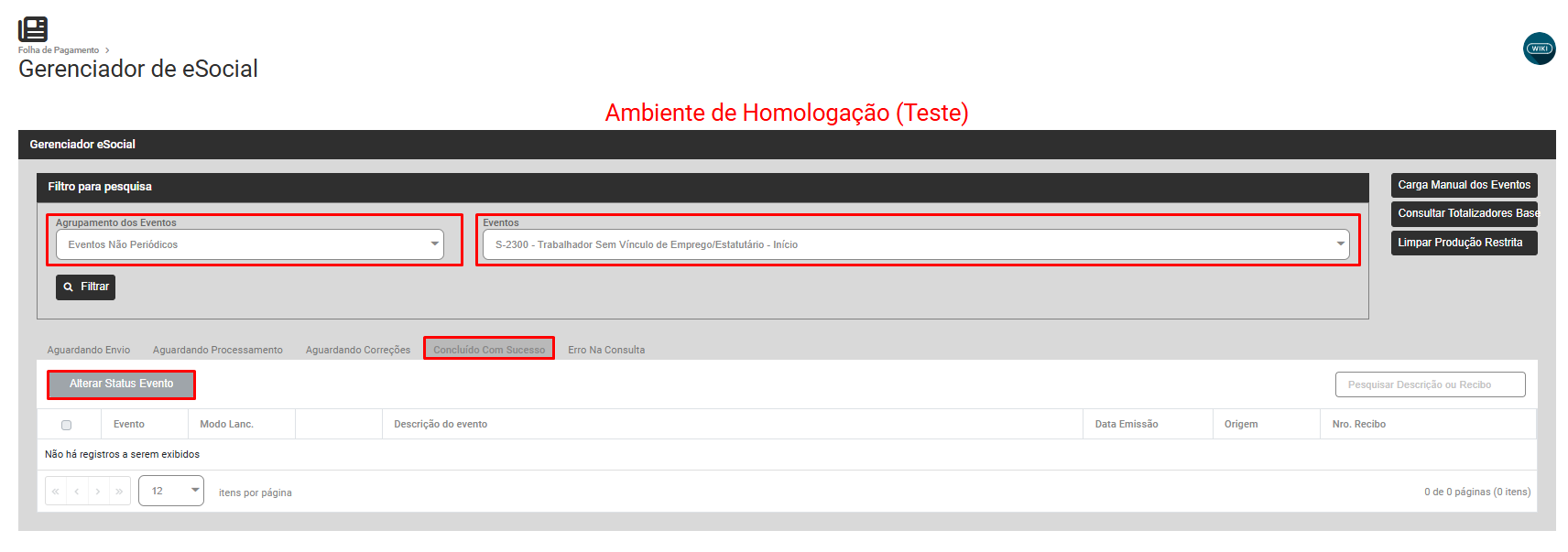 Filtre por Eventos Não Periódicos - S2300, Concluído Com Sucesso e clique no botão Alterar Status do Evento
