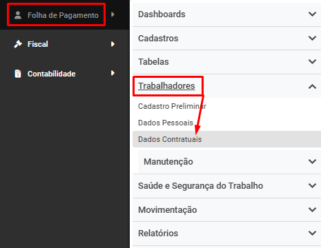 Acesse o menu Folha de Pagamento>Trabalhadores>Dados Contratuais