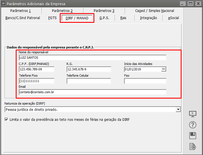 Causa: Ocorre quando não foi informado, ou está faltando informação dos dados do responsável da empresa, nos parâmetros.