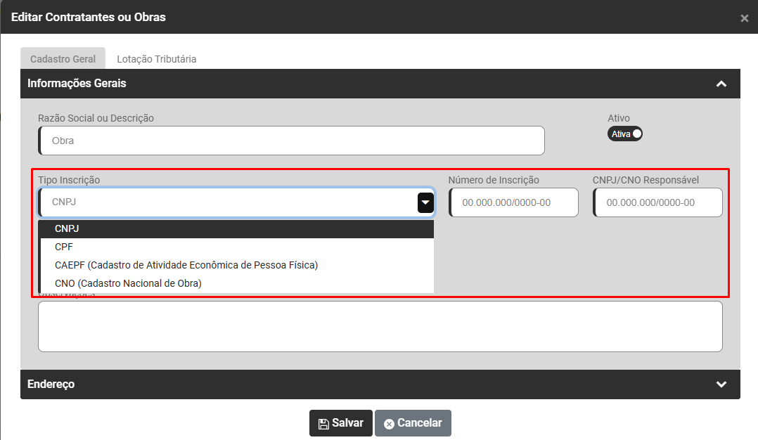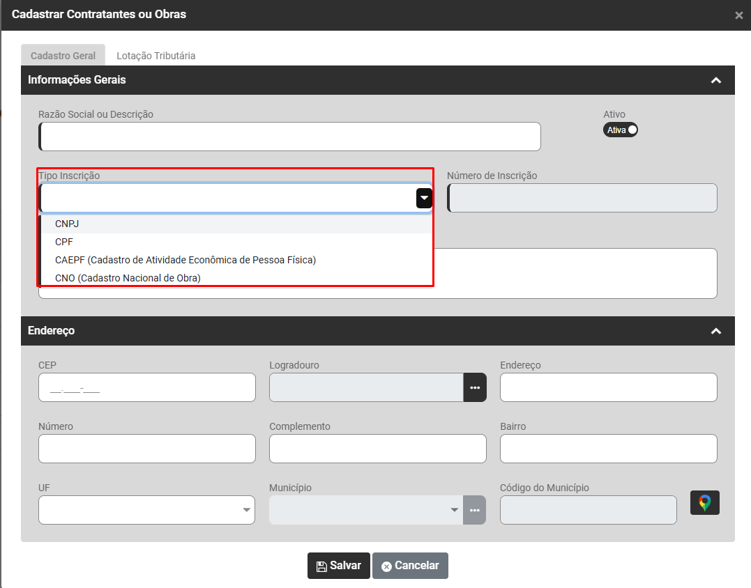 Verifique na aba Cadastro Geral o cadastro do Tipo de Inscrição e número de inscrição em seguida confira as demais informações