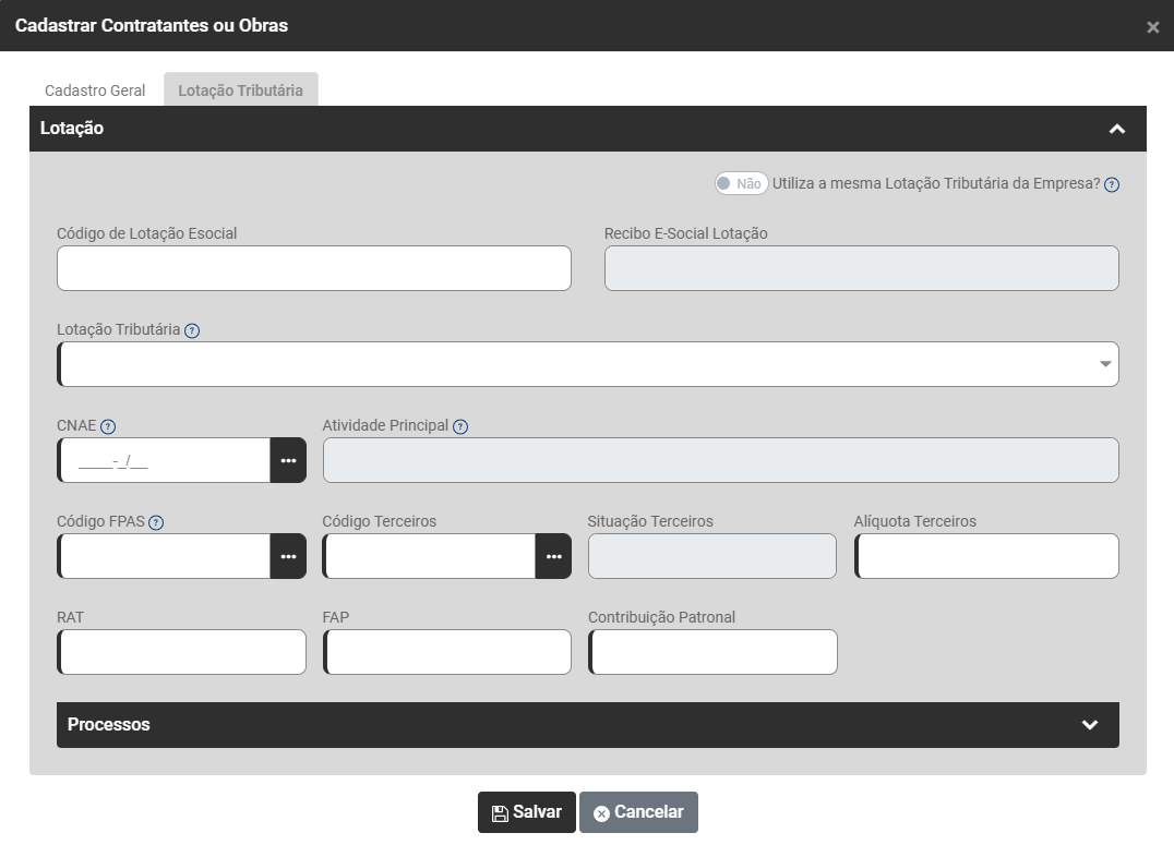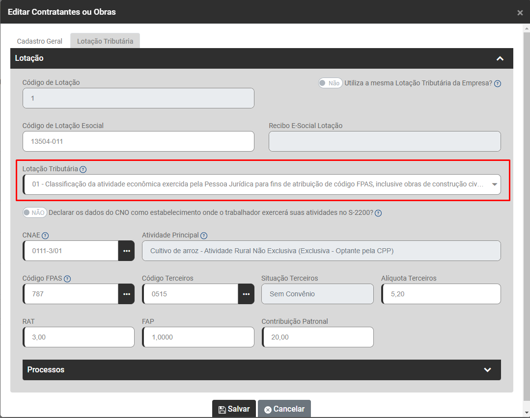 Verifique se na aba Lotação Tributária se os campos estão corretamente preenchidos. De acordo com as informações jurídicas da contratante. Caso não saiba as informações verifique com o seu jurídico ou com o jurídico da contratante: