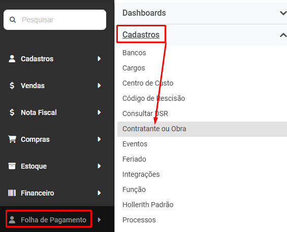 Correção: Acesse o menu Folha de Pagamento>Cadastros>Contratante ou Obra