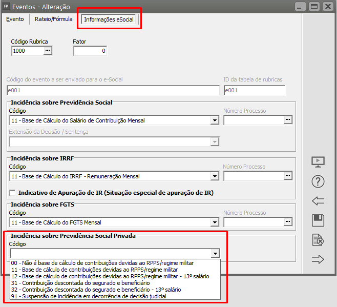 Como Corrigir: Acesse o menu Manutenção > Eventos > Manutenção, na aba eSocial, e informe a Incidência sobre Previdência Social Privada.