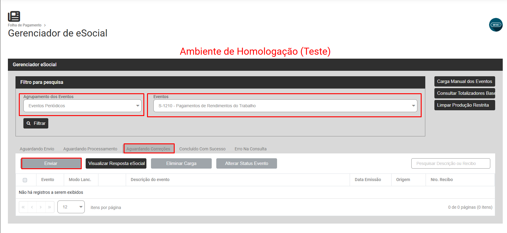 Pesquise por eventos periódicos - S1210, - Aguardando Correção, selecione o evento que apresentou a inconsistência e refaça o envio para o Portal do eSocial