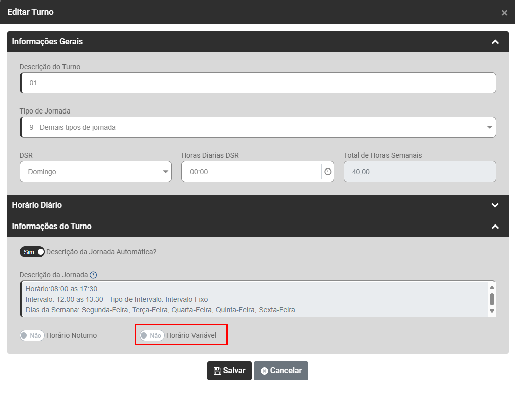 Se Horário Variável estiver selecionado com erro faça a correção da informação e salve novamente o cadastro do turno