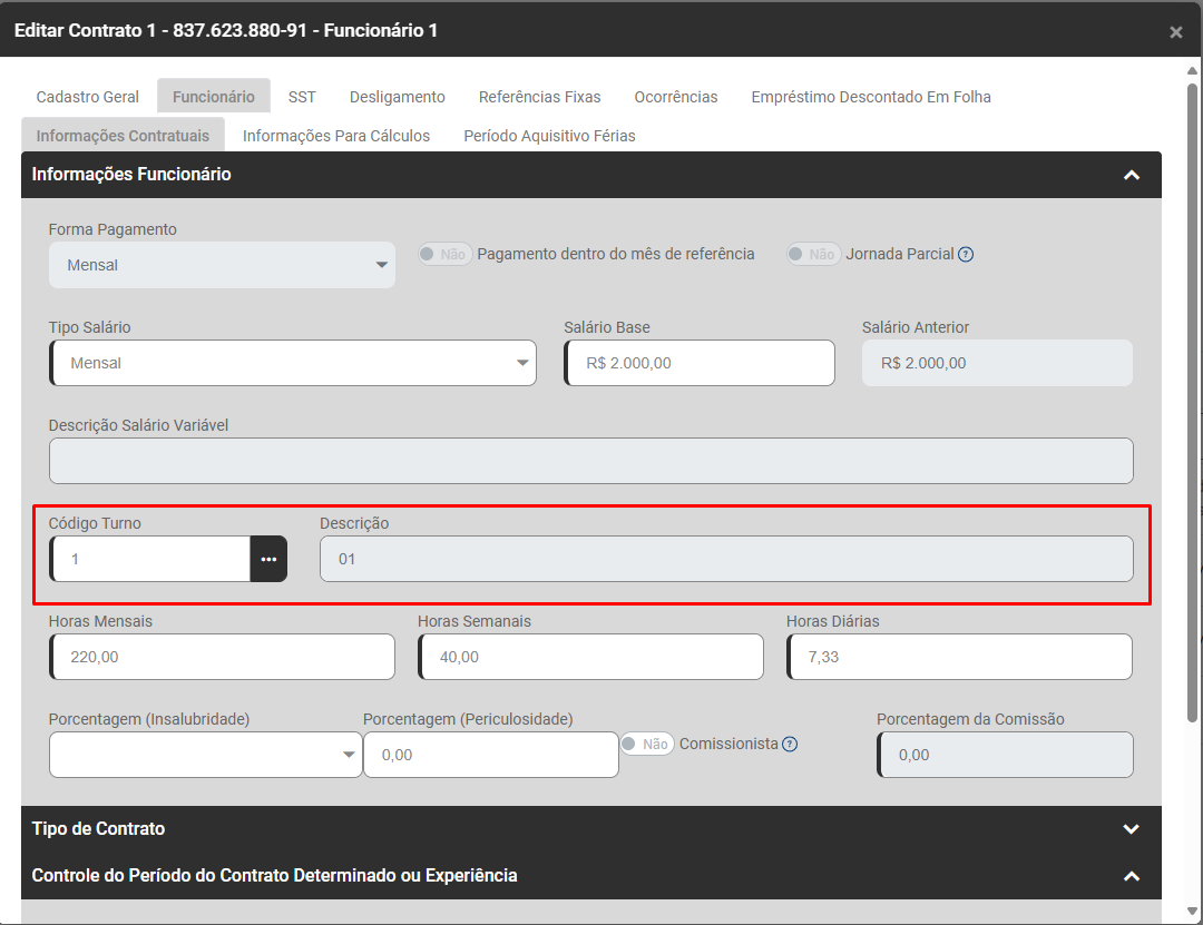 Edite os Dados Contratuais do Trabalhador que apresentou a inconsistência e verifique na aba Funcionário>Informações Contratuais e verifique qual o Turno do Trabalhador