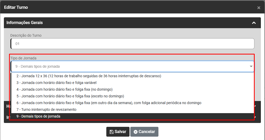 Edite o Turno do Trabalhador que apresentou a inconsistência e verifique na aba Informações Gerais, qual é o Tipo de Jornada daquele Turno, faça a correção da informação