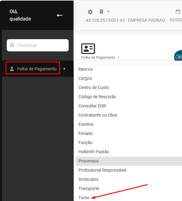 Em seguida acesse o Menu Folha de Pagamento>Cadastros>Turno