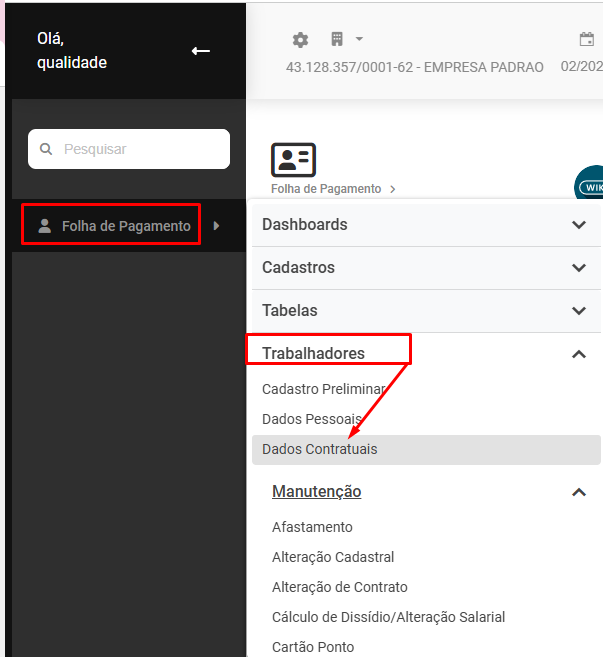 Correção: Acesse o menu Folha de Pagamento>Trabalhadores>Dados Contratuais