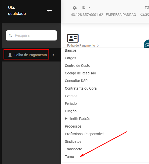 Em seguida acesse o menu Folha de Pagamento>Cadastros>Turnos