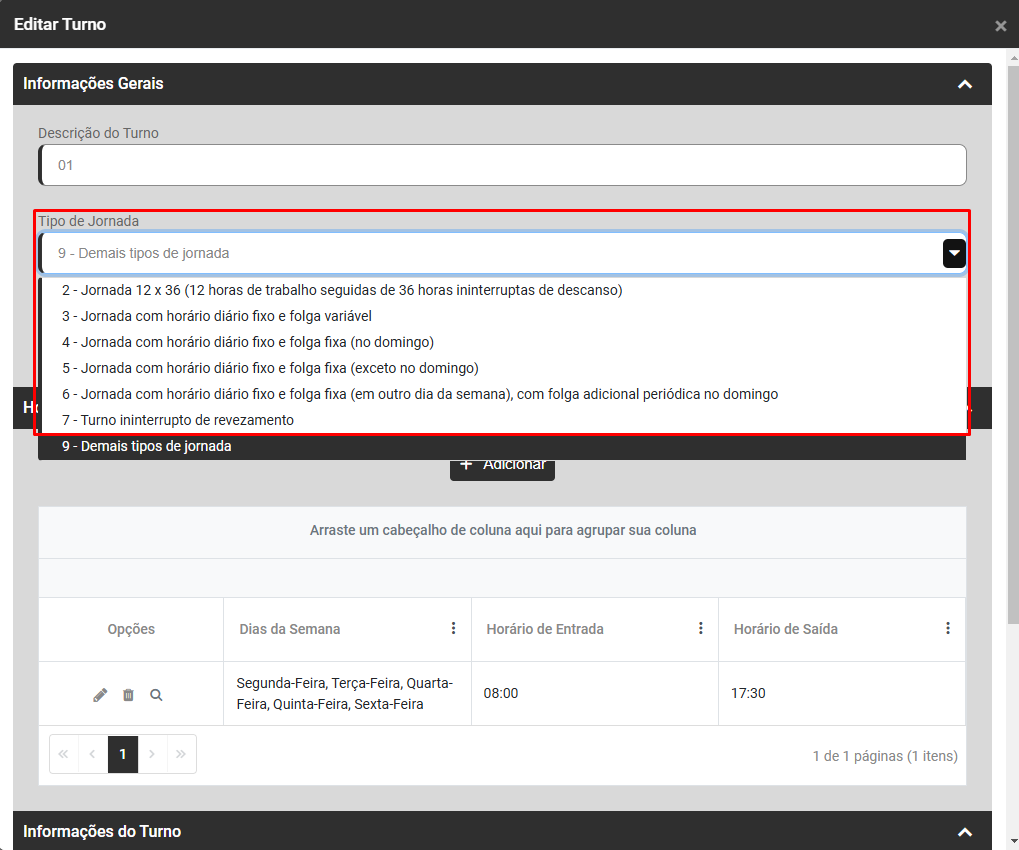 Ação Sugerida: Informar o Tipo de Jornada no cadastro Turno.