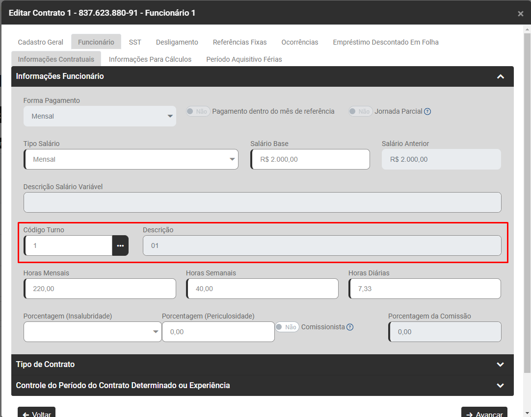 Edite os Dados Contratuais do Trabalhador que apresentou a inconsistência na aba Funcionário>Informações Contratuais - Campo Funcionário>Informações Contratuais>Informações Funcionário - Campo Código do Turno e verifique qual é o Turno cadastrado para o Trabalhador