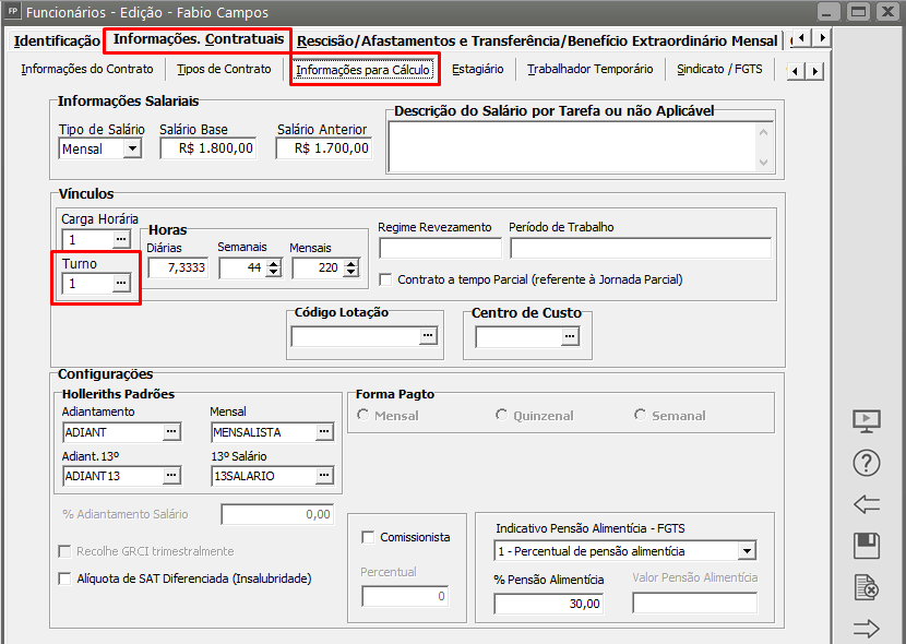 - Acesse o cadastro do funcionário na aba 'Informações Contratuais>Informações para Cálculo' e verifique o turno informado: