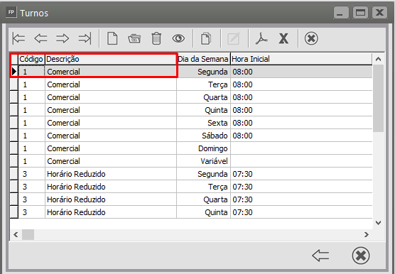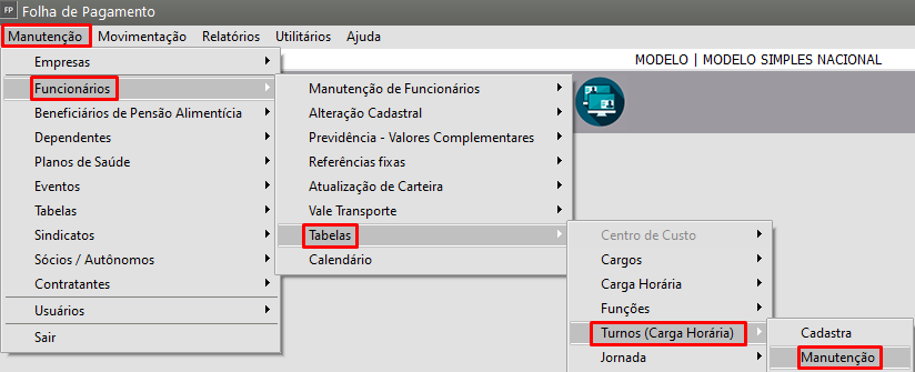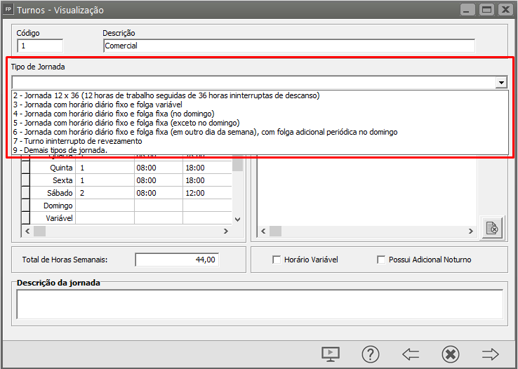 Após, acesse ‘Manutenção>Funcionários>Tabelas>Turnos (Carga Horária)>Manutenção’, abra o Turno informado no cadastro do funcionário e verifique se tem tipo de jornada informado: