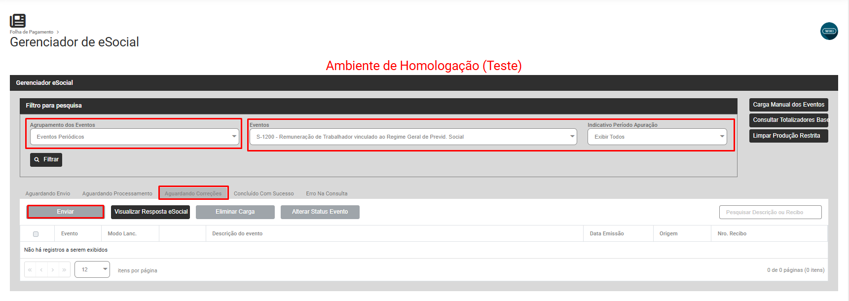 Filtre por Eventos Periódicos - S1200, aguardando correção, selecione o evento que apresentou inconsistência e faça novamente o envio para o eSocial