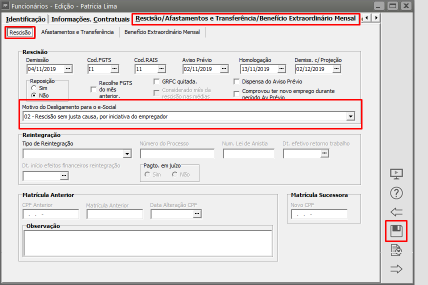 Abra o cadastro e vá na aba aba Rescisão/Afastamentos e Transferência/Benefício Extraordinário Mensal > Rescisão. Faça o preenchimento do motivo do desligamento e salve.