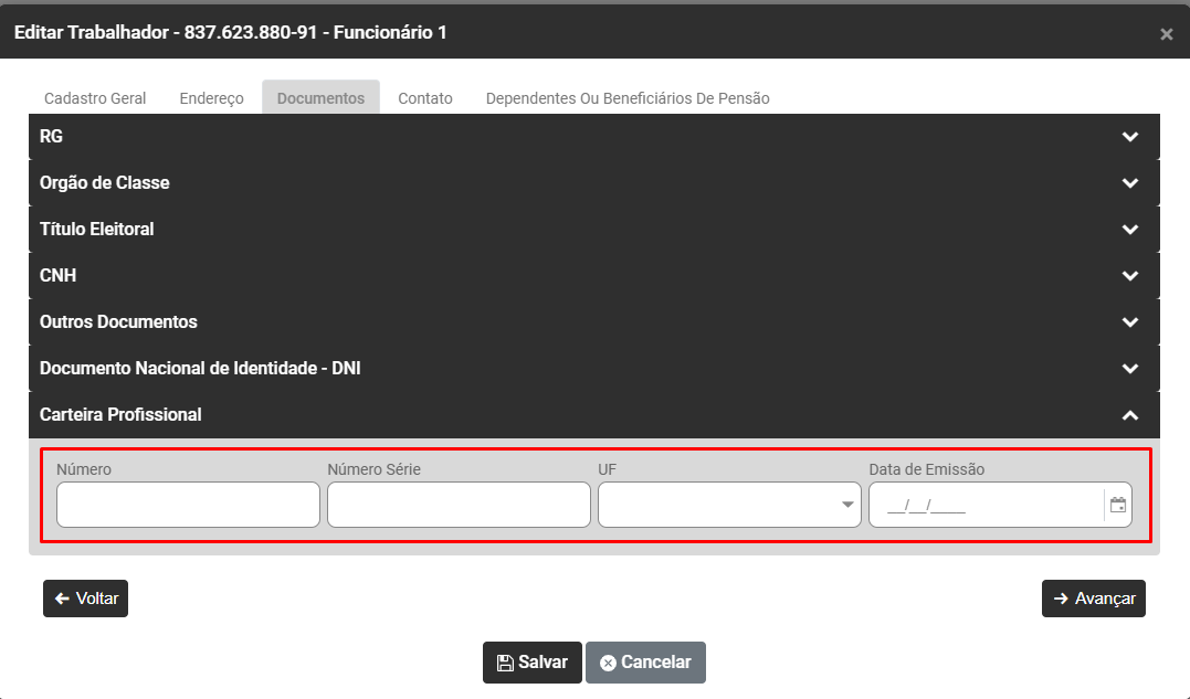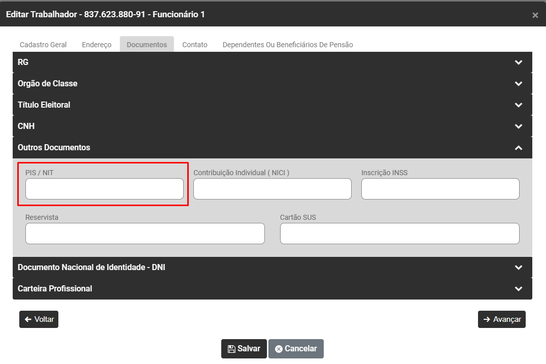 Abra o cadastro do funcionário. Na aba 'Documentos', verifique se o campo 'P.I.S./N.I.T.' está preenchido e caso esteja, verifique se o número indicado está correto, verifique também se o Número da Carteira Profissional está preenchido. Faça as devidas alterações, e salve.