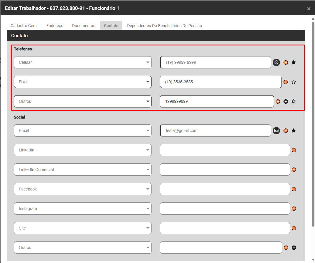 Edite os Dados Pessoais do Trabalhador que apresentou a inconsistência na aba Contato - Campo Telefones e faça a correção da informação