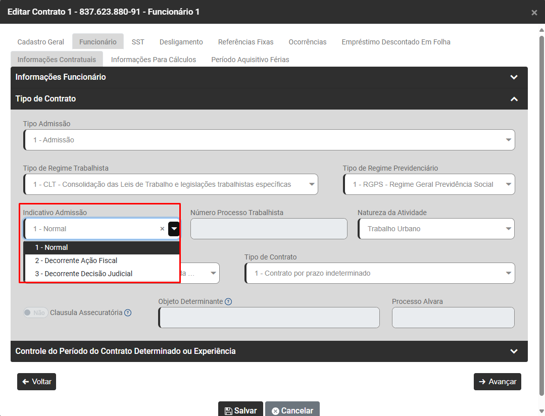 Ação Sugerida: Verifique a aba 'Tipo de Contrato' no cadastro do funcionário.