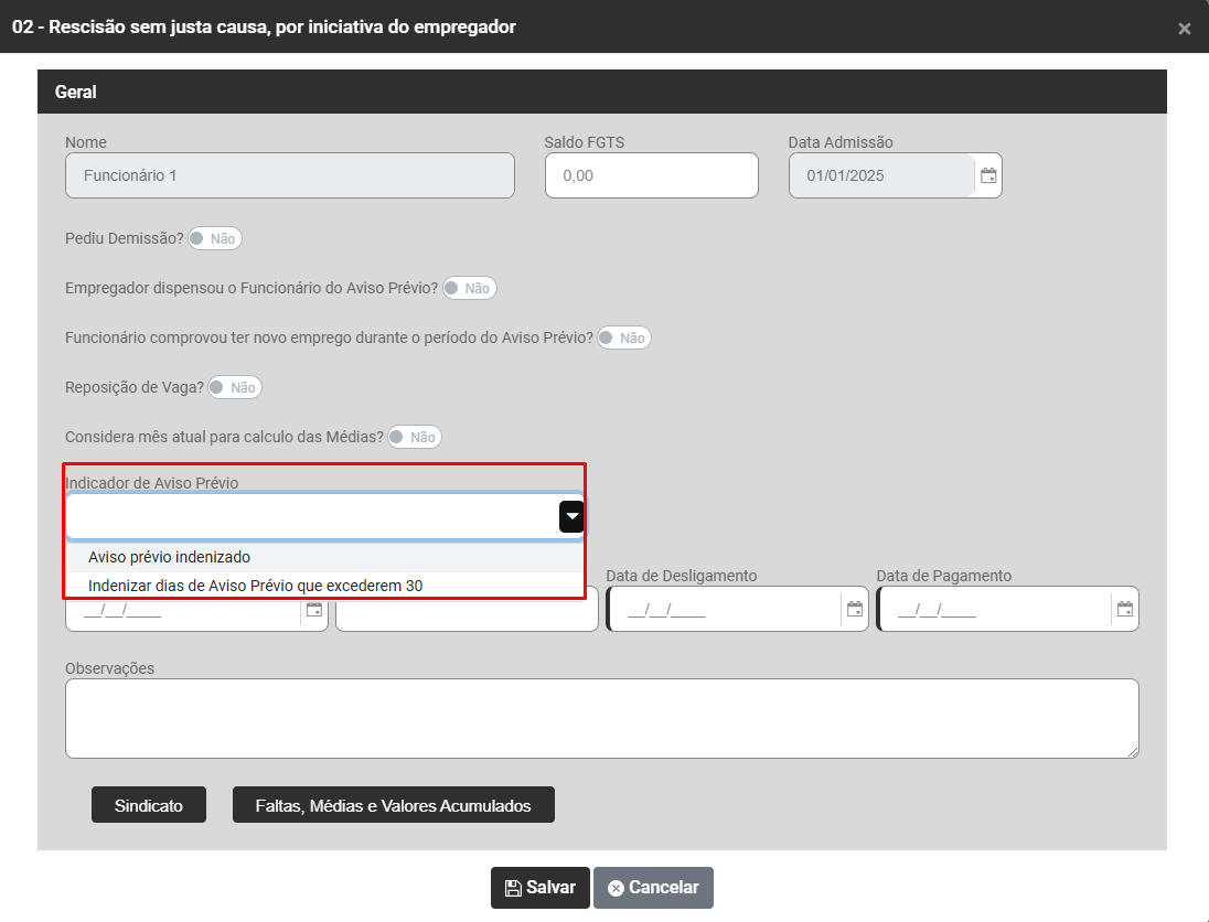 Após clicar em Gerar, faça a conferência do campo Indicador de Aviso Prévio