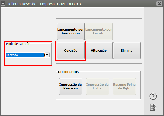 Acesse o modo 'Rescisão' e clique em 'Geração'.