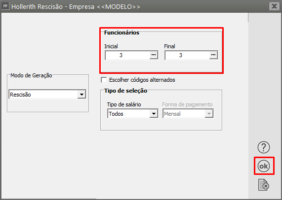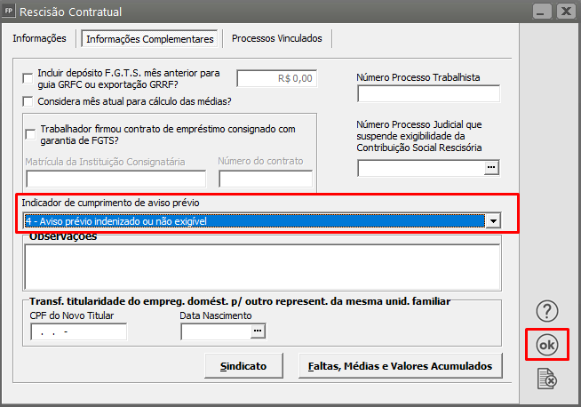 Faça o preenchimento do campo 'Indicador de cumprimento de aviso prévio' e clique em 'OK'.