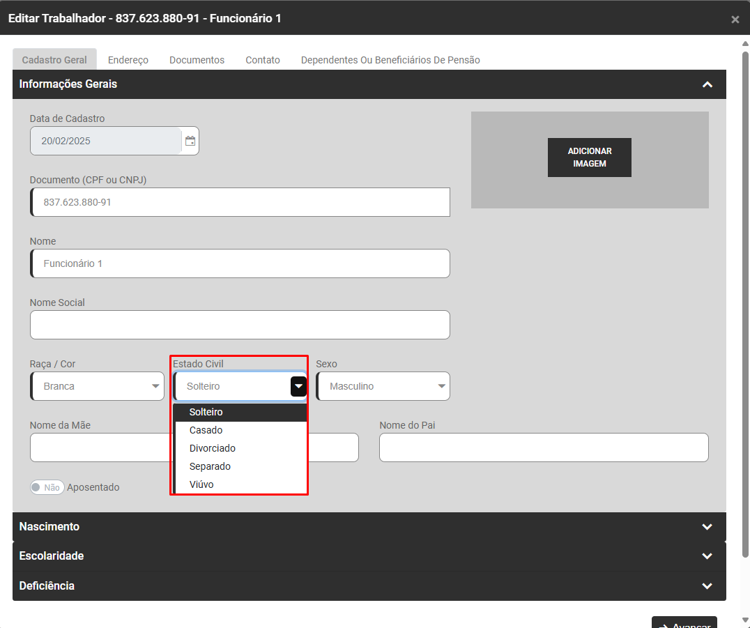 Edite os Dados Pessoais do Trabalhador que apresentou a inconsistência na aba Cadastro Geral>Informações Gerais - Campo Estado Civil e faça a correção da informação