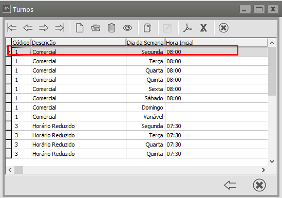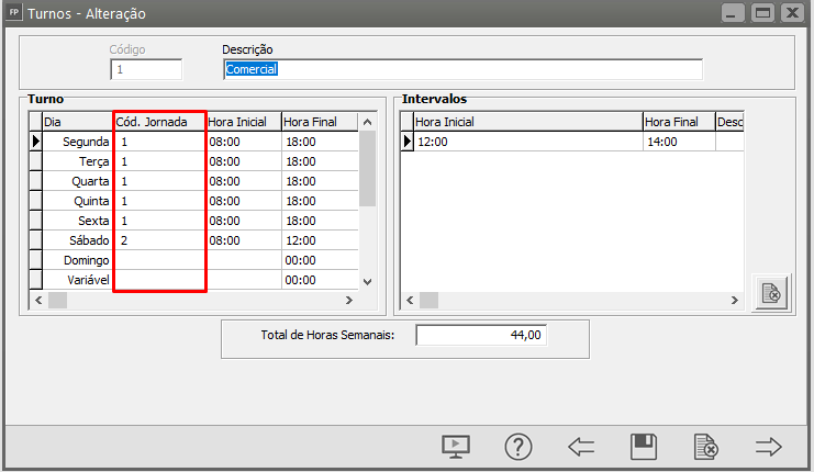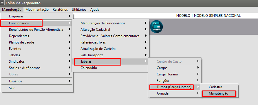 Manutenção > Funcionários > Tabelas > Turnos (Carga Horária) > Manutenção