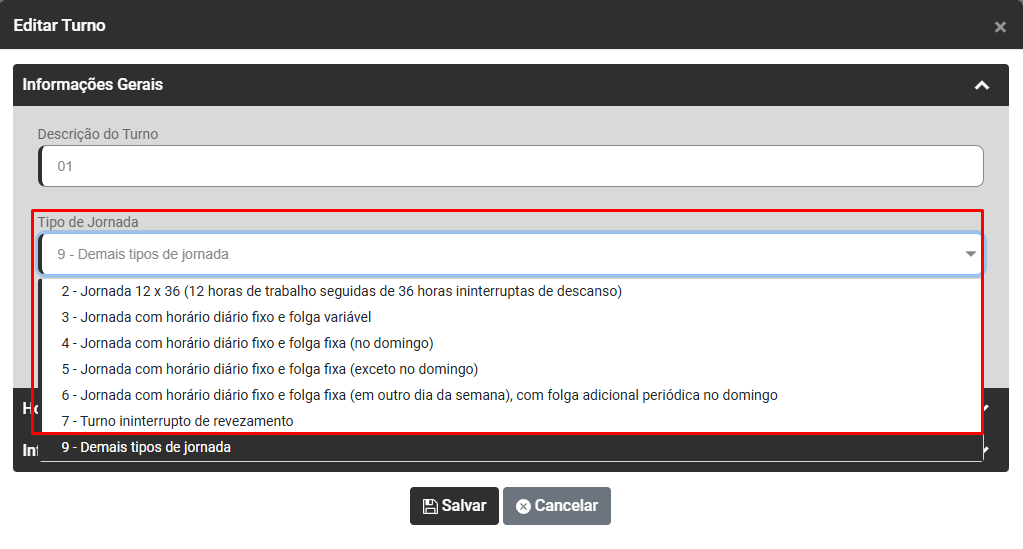Edite o cadastro do Turno do Trabalhador que apresentou a inconsistência no menu Informações Gerais e faça a conferência do campo Tipo de Jornada